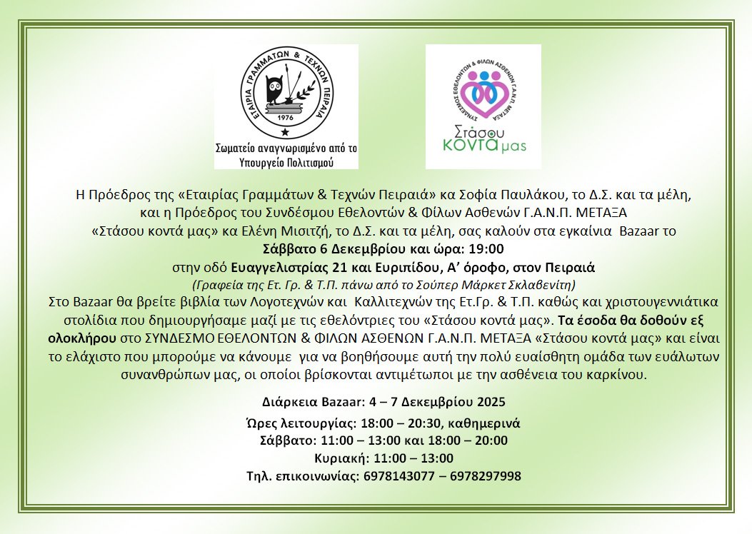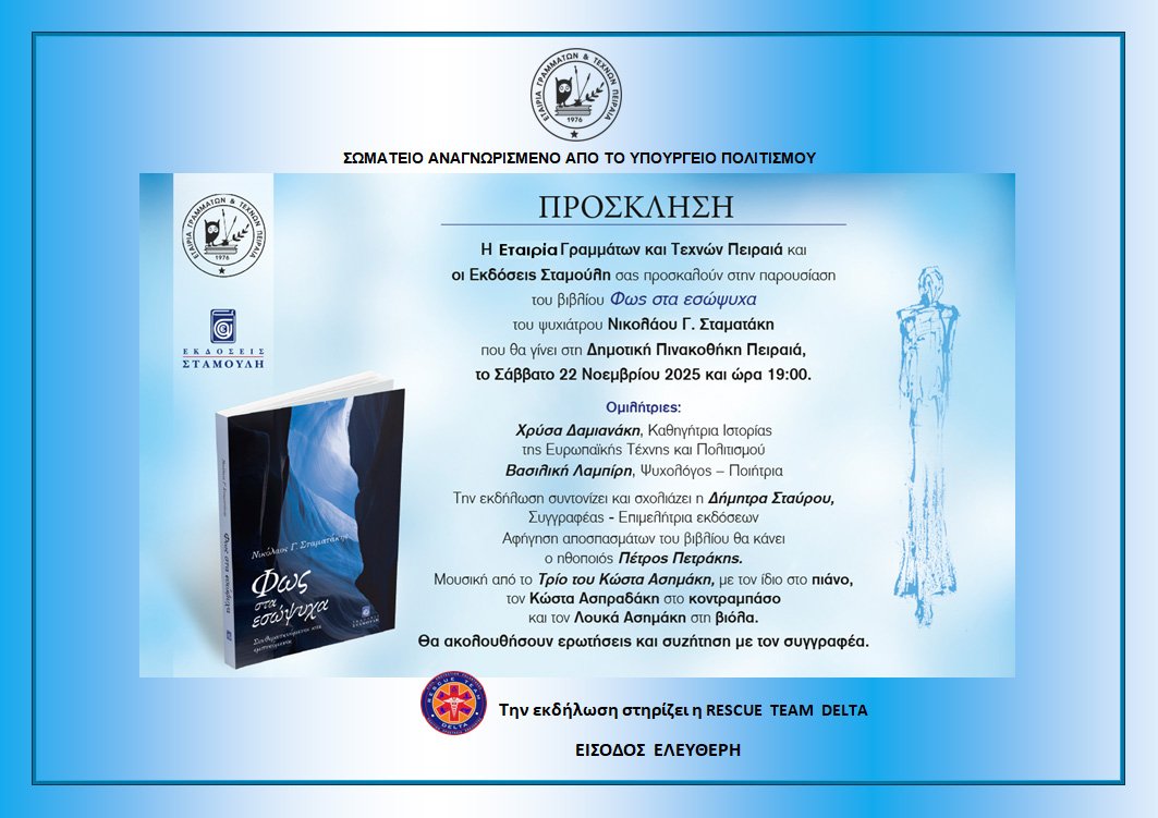 Η Ετ. Γρ. & Τ.Π. θέλοντας να προσφέρει το ελάχιστο στο σημαντικό έργο που κάνουν, ζήτησε από τον καρδιοχειρουργό Δρ Γρηγόρη Παττακό, ο οποίος έχει έρθει από το Χιούστον, να κάνει σχετική ομιλία στις ομάδες των Εθελοντών του Ερυθρού Σταυρού Πειραιά, η οποία θα γίνει στις 18 Μαρτίου, στις 19:00 στον Πύργο του Πειραιά όπου είναι τα γραφεία.